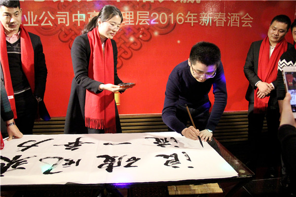 酒會上,雷鳴董事長作了重要講話,向全體中高管理層成員拜年,感謝全體成員一年來為公司發(fā)展辛苦的付出與努力,并希望新的一年大家共同努力,讓公司繼續(xù)大展宏圖、欣欣向榮。之后,各分公司、事業(yè)部、部門紛紛以創(chuàng)新、幽默、多樣的方式向全體參會人員拜年。生產(chǎn)制造中心以喜慶的春聯(lián)為依托,在表達新春祝福的同時,還帶來了印有“安全第一 質(zhì)量為本”字樣的員工集體簽名橫幅,為確保產(chǎn)品質(zhì)量作出承諾;凈水家電事業(yè)部總經(jīng)理王悅生的現(xiàn)場即興題字,用丹青妙筆表達了其部門成員奮勇爭先的目標和信心;工程事業(yè)部總經(jīng)理劉東帶領其部門成員所采用的“三句半”拜年方式贏得了滿堂喝彩;財務部與企劃部共同合作的“異口同聲”有獎競猜創(chuàng)意拜年,更是傳達了“榮事達一家親”的美好寓意。