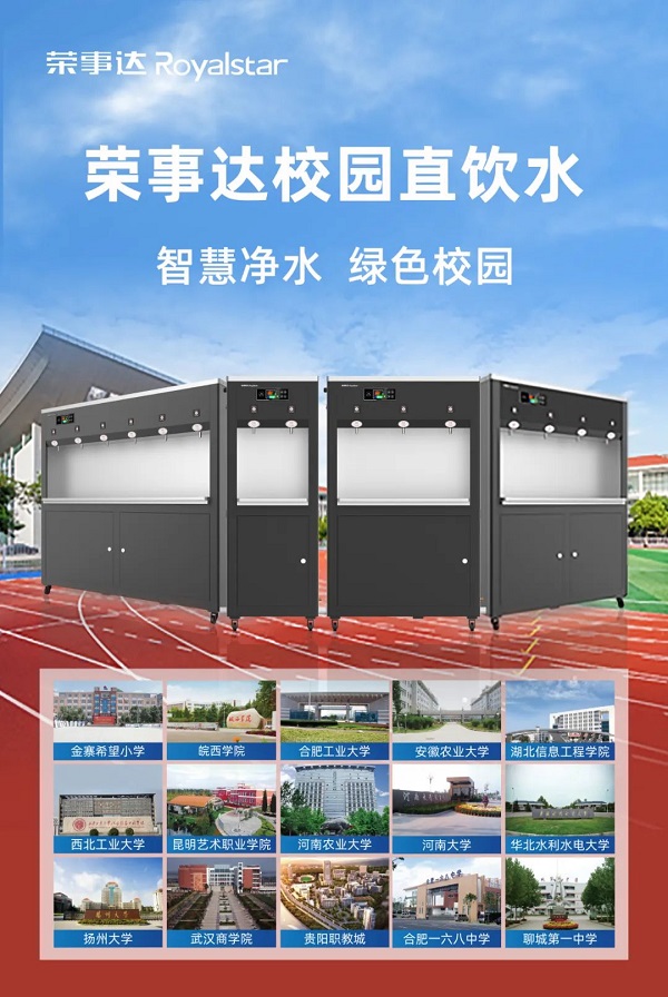 榮事達水工業先后承建了中國科學技術大學、河南大學、武漢商學院、江蘇省丹陽市第五中學等3500多所學校的直飲水工程,‘喝’護千萬師生飲水健康。