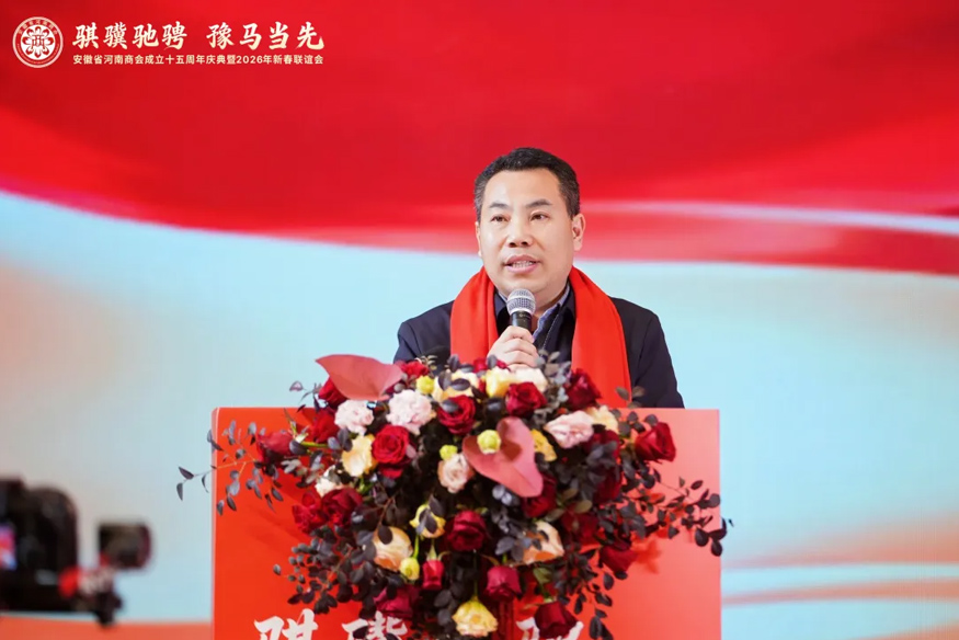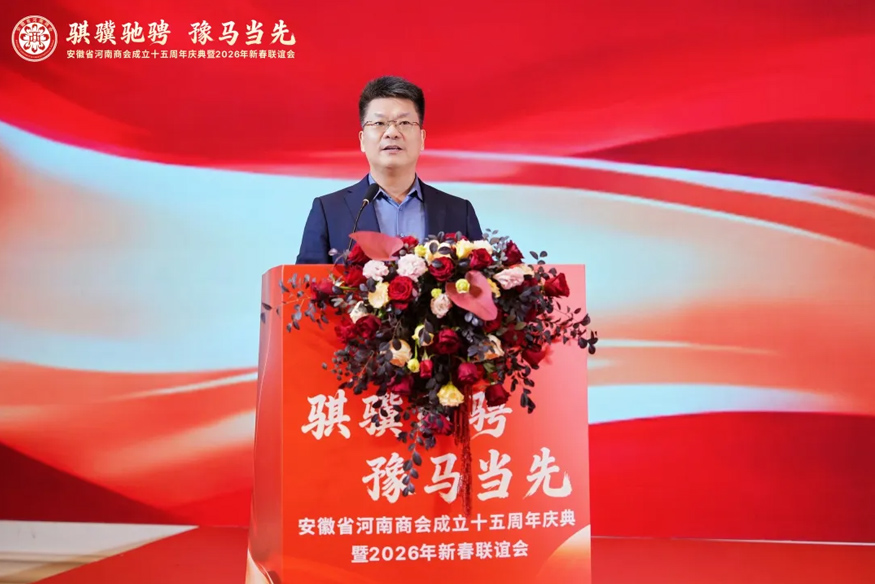 騏驥馳騁,豫馬當(dāng)先。元月25日下午,安徽省河南商會(huì)成立十五周年慶典暨2026年新春聯(lián)誼會(huì)在合肥白金漢爵大酒店隆重舉行。安徽省食品藥品監(jiān)督管理局原一級(jí)巡視員李長(zhǎng)在,安徽省合作交流辦公室副主任陳龍,安徽省社會(huì)組織總會(huì)會(huì)長(zhǎng)、安徽省審計(jì)廳原一級(jí)巡視員賈寶明,安徽省工商聯(lián)三級(jí)調(diào)研員宋翠琳,安徽省退役軍人事務(wù)廳原一級(jí)巡視員梅德林,安徽省邊防總隊(duì)原政委袁同海,一〇五醫(yī)院原副院長(zhǎng)趙連才,安徽省國(guó)土資源廳原紀(jì)檢組長(zhǎng)江獻(xiàn)軍,安徽省委人事廳原編委辦主任趙振英,安徽省經(jīng)信廳原老干部局局長(zhǎng)展巖,安徽省煤炭設(shè)計(jì)院原院長(zhǎng)閆紅新,安徽省衛(wèi)生管理學(xué)院原副院長(zhǎng)趙國(guó)子,安徽省委政法委原掃黑辦副主任張劍鋒,安徽省委黨校原二級(jí)巡視員張金友等與駐馬店市商務(wù)局副局長(zhǎng)柳曉剛、市工商聯(lián)副主席張永紅等家鄉(xiāng)領(lǐng)導(dǎo)出席盛會(huì)。在皖兄弟商會(huì)、省級(jí)異地商會(huì)及友好商協(xié)會(huì)、全體會(huì)員及社會(huì)各界朋友500余人齊聚一堂,共敘鄉(xiāng)梓情誼,共話發(fā)展新篇。